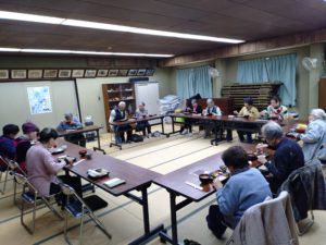 2月2日 高齢者食事サービスの食事会を開催しました。今回のお弁当は新北野の評判の良いお弁当屋さんのお弁当で食事会。具沢山のお味噌汁と一緒に味わいながら、楽しい時間を過ごしました。