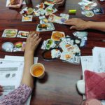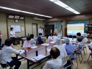 今日は(8月4日)『栄養の日』ということで、【毎日の食事に活かせる栄養バランス術】を学びました。各々の一日の食事の中で、主要な10品目がとれているかのチェックや、主食、主菜、副菜二つを意識して買い物や夕食の献立を揃える相談をしてみたりと、和気藹々と講義とおしゃべりを楽しみながら学びました。