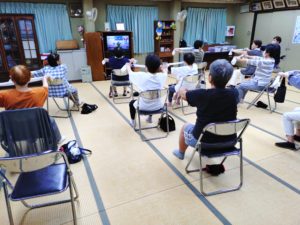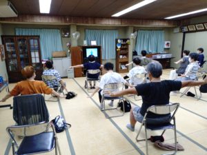 9月4日 百歳体操開催しました。今朝は、湿度も高く雨模様。傘を片手に来場、体操に参加する方がほとんどでした。下の写真はタオル体操に腕を回す運動と深呼吸です。