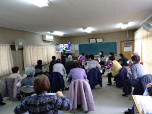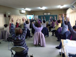 1月13日 (北班)百歳体操 開催しました。北風は冷たいですが、日差しは暖かくウオーキングもかねて体操に参加している方もおられます。下の写真はお馴染みのタオル体操「ボート漕ぎ運動」と百歳体操の「深呼吸」です。今日も元気にいきましょう。