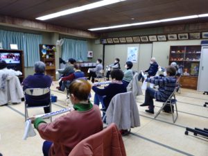 1月22日 百歳体操開催しました。本格的な冬将軍到来、朝方は冷え込むので「中々布団から抜け出せない。」「外出に勇気がいる。」との声もありますが、「みんなでおしゃべりして運動すればあったかくなるので。」という方もいらっしゃいます。しっかり温まって、おしゃべりも楽しんでいってください。