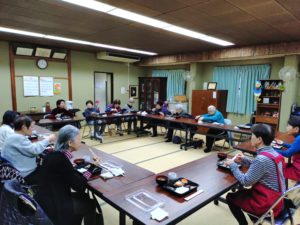 12月1日 高齢者食事サービスの食事会を開催しました。気温は暖かく、雲一つない快晴。食事会に参加された方も多く、おしゃべりを楽しみ、具沢山のお味噌汁といれたての日本茶、そしてお弁当を味わいました。