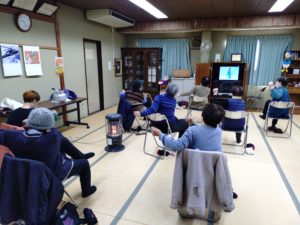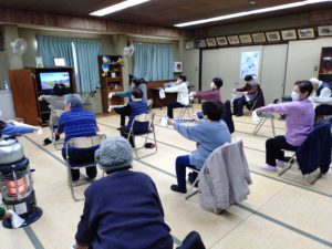 2月19日 百歳体操開催しました。寒い日が続いていますが、しっかり運動して楽しくおしゃべりすれば、ある程度の寒さは気にならなくなるかも?