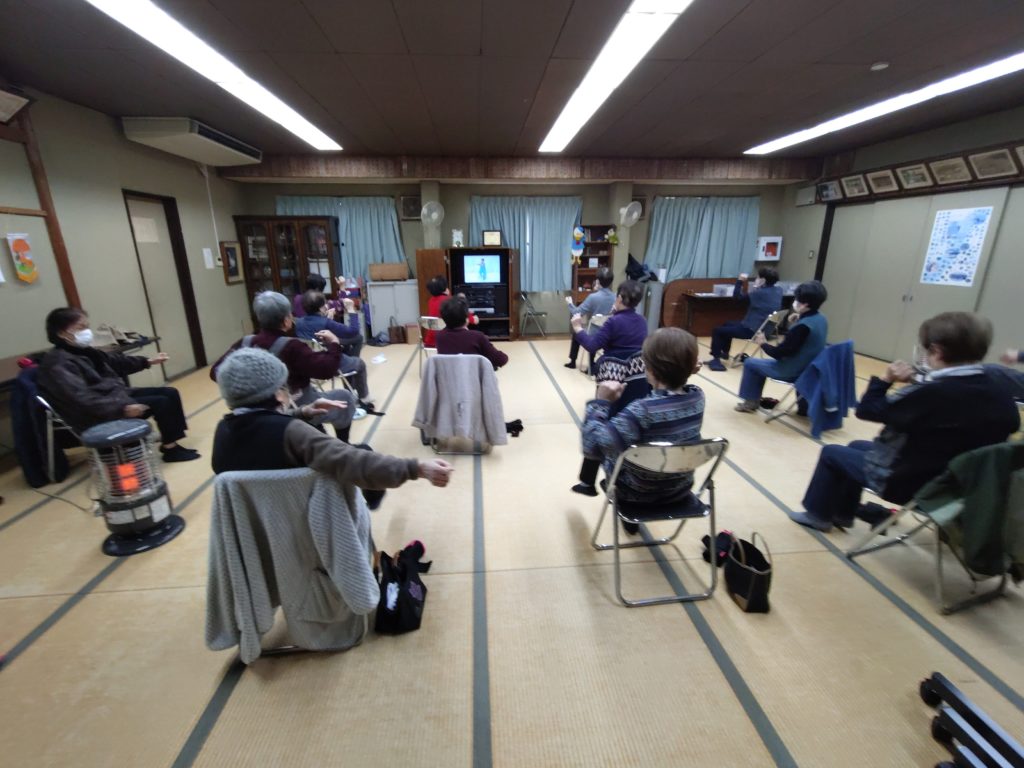 2月26日 百歳体操開催しました。今日は曇り空。湿度も高めですが、皆さん元気に体操に取り組んでいます。