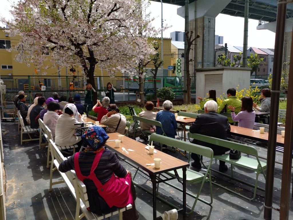 4月6日 高齢者食事サービスのお花見会を開催しました。お天気に恵まれて陽射し暖かく過ごしやすい日。具沢山のお味噌汁とお汁粉春のそぼろ弁当を桜と満開の菜の花を鑑賞しながら味わい、催し物とおしゃべりと花見を楽しみました。